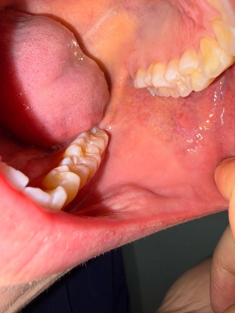 현재 사진에서는 구강암이나 큰 문제가 보이지 않습니다. 단순히 치아의 날카로운 부분이 한 번 상처를 낸 이후에 지속적으로 연조직이 닿아서 생기는 문제일 가능성이 가장 높아 보입니다. 물론 간혹 구내염을 동반한 연조직 질환이나 타액선 염 등에 의해서도 나타날 수 있습니다. 따라서 정확한 판단을 위해서는 가까운 치과 방문 후 검사를 해보는 것이 가장 좋습니다.