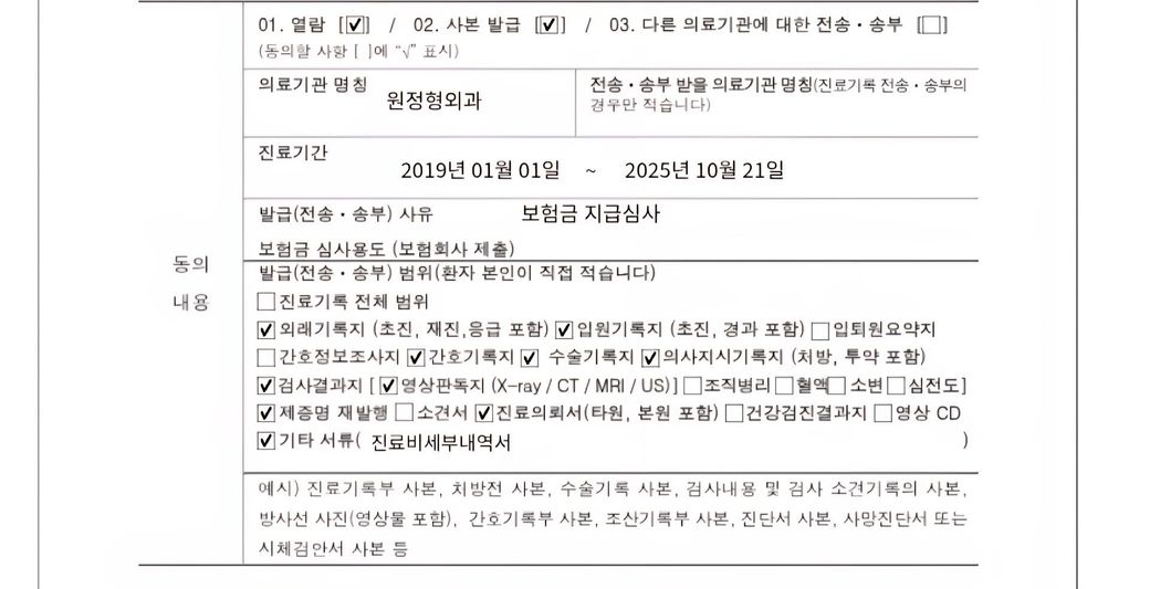 : 해당서류로는 해당 의무기로 열람동의서에 기재된 의료기관의 해당 과에 대한 해당 되는 기간의 해당되는 항목에 해당되는 의무기록만 확인할 수 있습니다. 해당 열람동의서에 기재되지 않은 의료기관, 해당되지 않는 기간, 해당되지 않는 항목은 열람이 되지 않습니다.