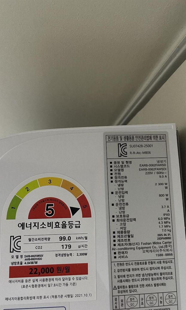정격능력도 하나만 적혀있고, 에너지 등급도 5등급이라고 써있어서요