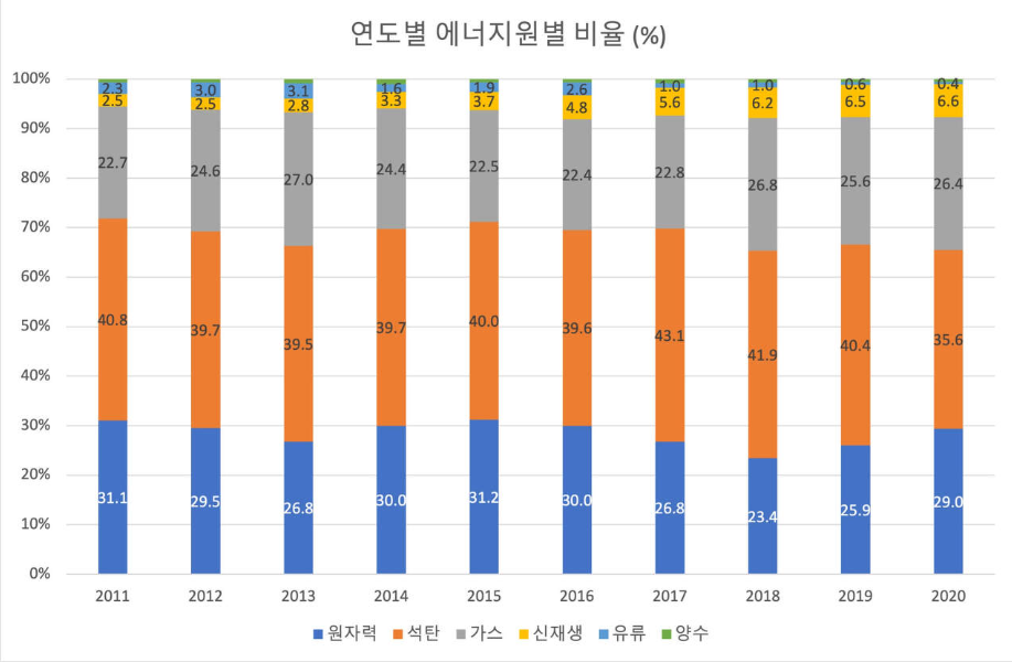 지난 문재인 정부 당시에 했던 정책이 바로 원자력 폐기와 신재생에너지 산업에 대한 투자를 증가시키면서 원자력에 대한 비중이 점차적으로 낮아졌습니다. 아래의 사진은 2020년도까지 에너지원별 비율을 나타낸 사진입니다.