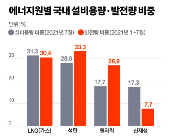 사진을 보게 되면 원자력에 대한 비중은 점차 축소되면서 반대로 신재생에너지의 비율은 증가하는 것을 볼 수 있습니다. 하지만 에너지원별로 설비용량과 발전량의 비중을 보게 되면 신재생 에너지의 효율성이 얼마나 떨어지는 다음의 사진을 보시면 확인이 가능합니다.