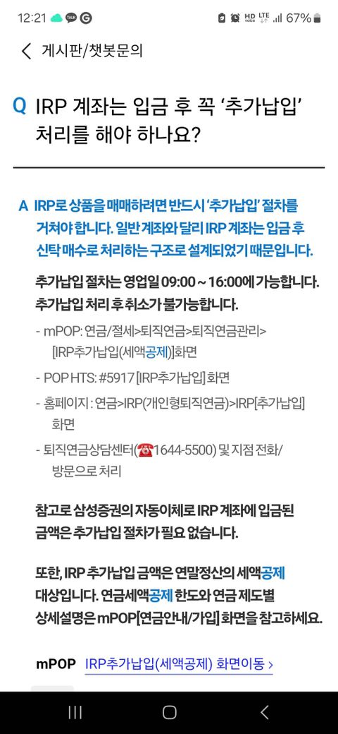 삼성증권에서 개인형 irp 계좌를 개설했는데 해당 계좌에 돈을 예치할 경우 따로