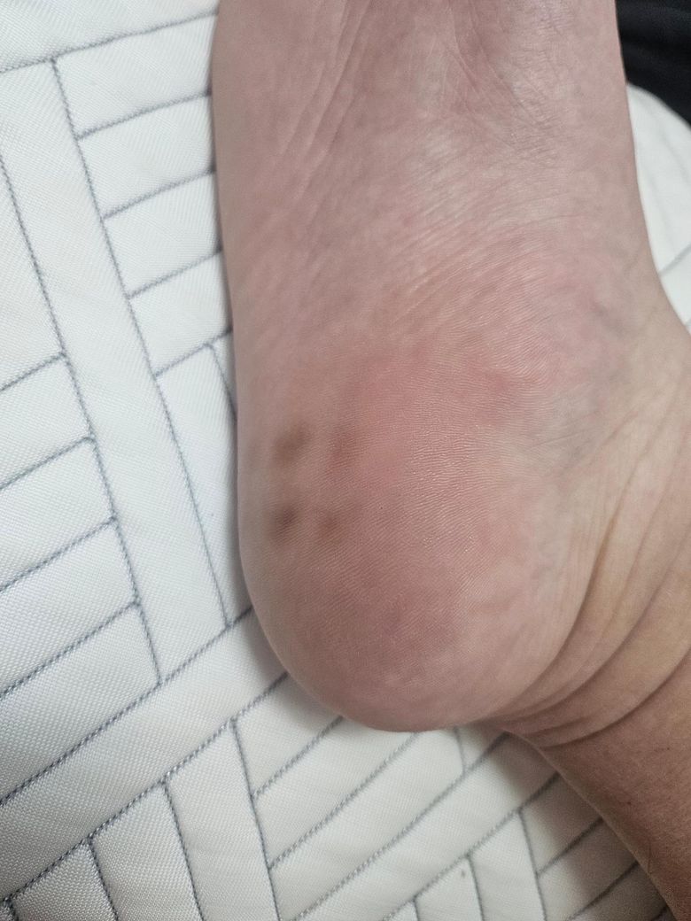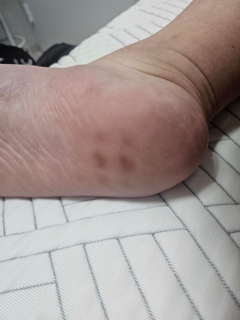 3~4일 쯤 전에 처음 본 것 같은데, 처음엔 어디 눌려서 자국이 남은 줄 알고 넘어갔어요. 근데 지금도 사라지지를 않아요. 최근에 이사하면서 내리막길, 오르막길 등 많이 걸어다니기는 했는데 그것 때문에 생긴 걸까요? 아니면 병원을 가봐야 하는 걸까요?