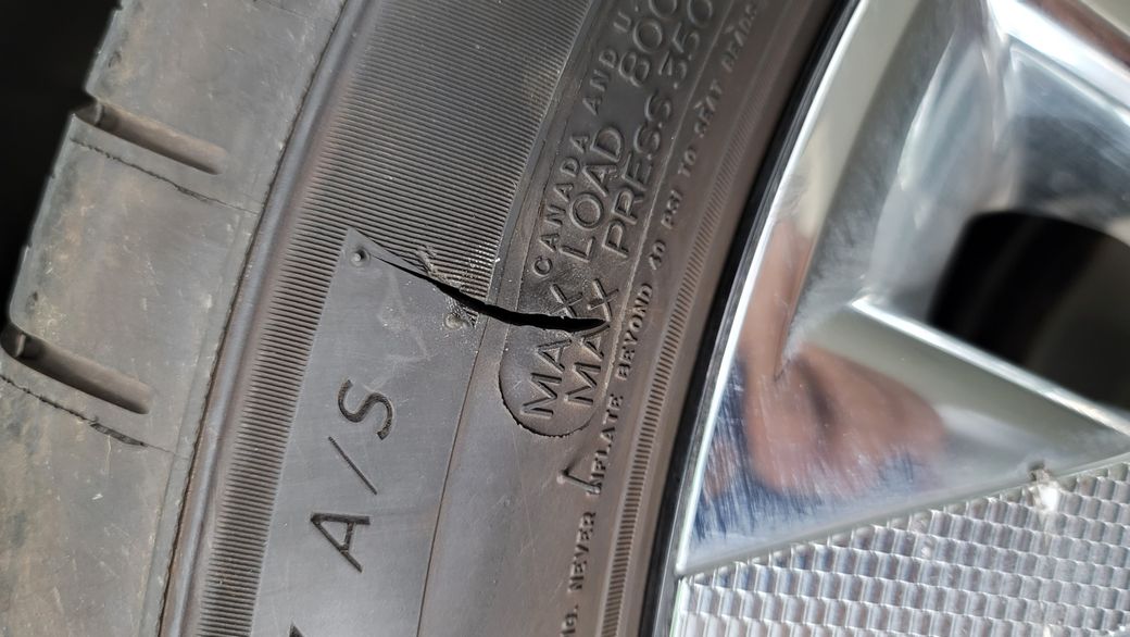 타이어 사이드월 쪽의 찢김은 무조건 교체하는것이 좋습니다.