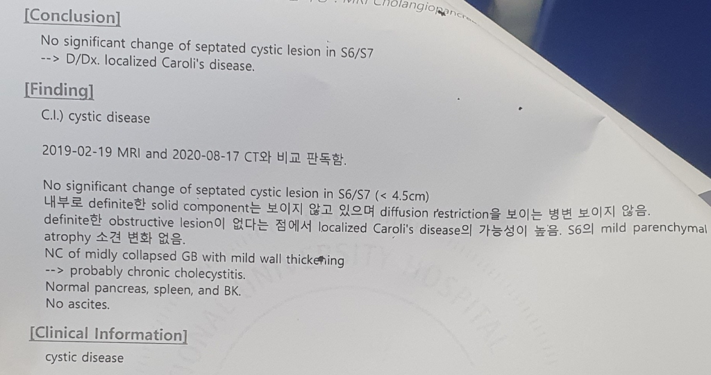 간의 낭성 병변에 대한 평가였고, 간에 존재했던 낭종에는 큰 변화가 없습니다. 담낭의 만성 염증소견이 관찰되는 상태이며 이외의 고형 장기에는 이상이 보이지 않는 상태입니다.