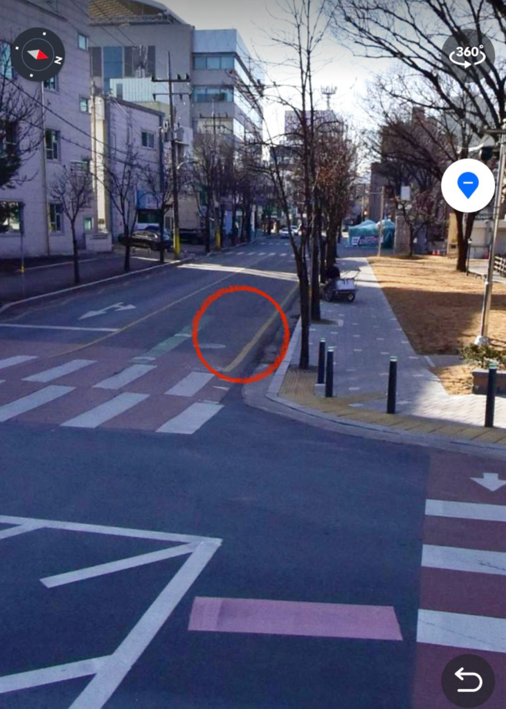 -> 사고 발생한 위치 로드뷰 (사고 당시에는 도로 양쪽에 줄지어 차량이 주차된 상태)