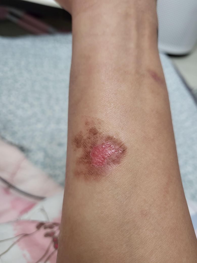 1명 평가2도 화상으로 보이는데 화상의 경우에는 관리를 잘 하고 하여도 흉이 남을 가능성이 상당히 높습니다. 시간이 꽤 경과한 상태로 보이는데 지금이라도 병원에 다니면서 화상 드레싱을 받으면서 경과를 지켜보시는 것이 좋겠습니다. 흉터가 남는 것은 불가피해 보입니다.