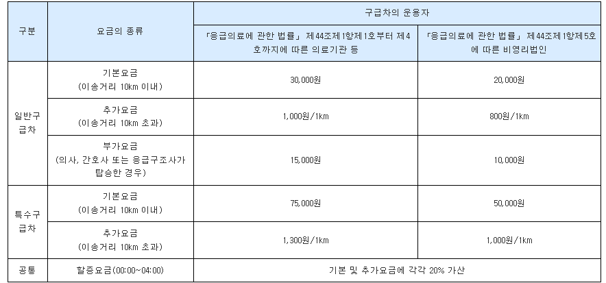 민간구급차를 이용할 경우 이송처치료를 지불해야 하는데, 그 기준은 다음과 같다고 하니 참고하시기 바랍니다.