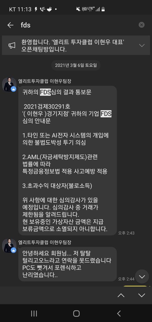 갑작스레 투자 전문가로부터 연락이 왔고 본인이 FDS 심의에 걸려 자신네 회사에 감사가 떠 업무용 피씨등 모두 압수 되었다 이제 풀려났다며 자신이 책임지고 자금 회수를 하여 고객에게 돌려주겠다며 약속 하였습니다.