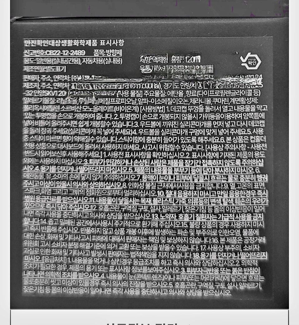차량용 디퓨저 광고를 보고 구입 했습니다. 15일정도 대시보드에 올려놓고 사용했는데 양이 너무 줄어서 들어봤더니 대시보드 가죽이 울어버렸어요. 구매처에 문의 해서 얘기했는데, 광고에는 주위 관련하여 사진 한장없이 말한대로 컵홀더에 저것을 넣고 써야된다는 사진도 없는 상태에서 광고 하단 끝에 잘보이지 않는 주위사항 내용 때문에 변상이 안된다고 합니다.