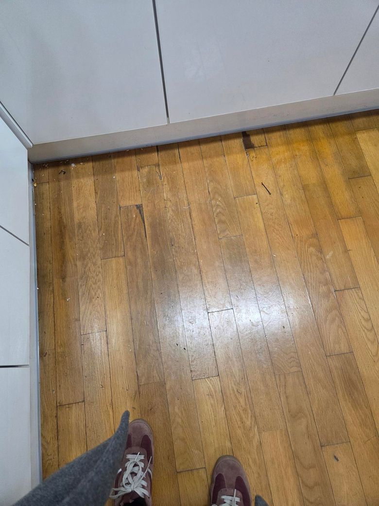 사용법: 마루 색상과 가장 유사한 색상의 스틱을 까진 부위에 메운 뒤, 헤라(밀개)로 평평하게 펴 바릅니다. 깊게 팬 곳은 이 과정만으로도 시각적으로 훨씬 깨끗해집니다.