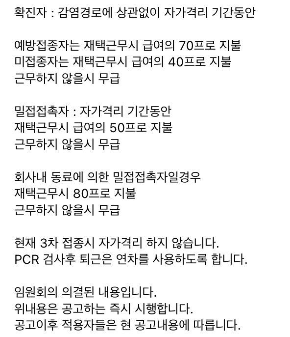 안녕하세요 회사에서 공고가 저렇게 내려왔는데 검색을 해봐도 자세한 내용이 없어서 여쭈어봅니다.. 저게 적용이 되는거라면 연차내고 자가격리하는게 훨씬 나을거같습니다.. 회사직원으로인해 걸렸는데 조금 억울하네요ㅜㅜ..