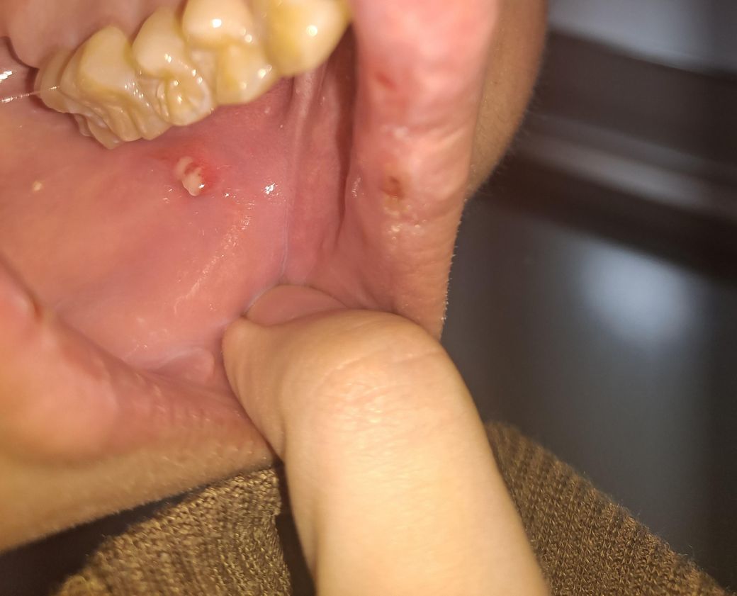 현재 사진상 구내염이 추가로 더 생긴 것으로 보입니다. 구내염이 생기는 것은 몸의 면역 저하 및 피로로 구강점막이 잘 되지 않아 나타나는 증상으로 염증을 완화하는 소독용 헥사메딘 가글액으로 가글하여 관리하고, 충분한휴식과 비타민 섭취를 권합니다.