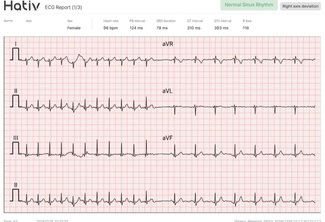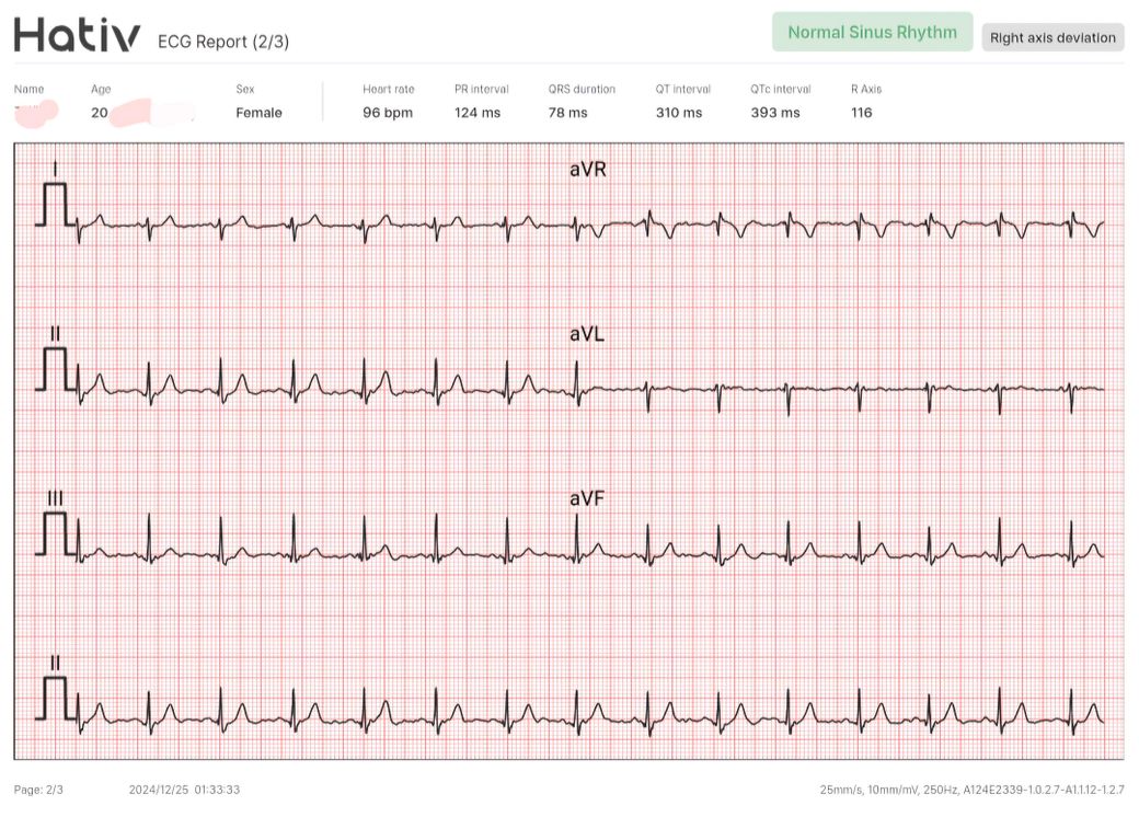제가 느끼기에는 초반에 170대까지 올라간거 같고(이때 기계로 측정한게 아니라 정확히는 몰라요) 심전도 찍고있을때는 150bpm후반에서 갑자기 80bpm후반으로 뚝 떨어지는걸 봤습니다. 금방 심박수가 돌아오는 바람에 정상심박수로 측정이 되서 정상 동리듬이 나와버렸는데, 이 심전도 사진으로는 psvt 진단이 어려울까요? 정말 정상 심전도가 맞는건가요?