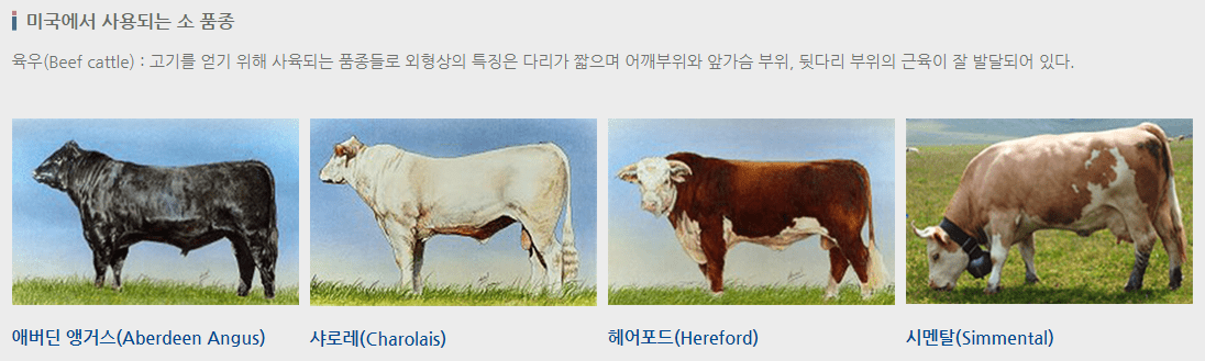 미국소의 경우 소의 종류가 많습니다. 위의 국내한 한우의 교잡종에 포함(앵거스, 샤로레,헤어포드 등)되는 종들이 낯이 익지요.