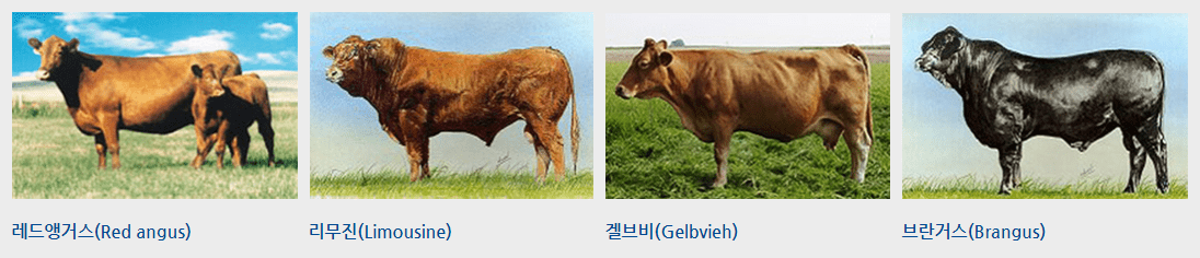 ④ 교잡우 : 홀스타인×한우, 샤로레×한우, 한우×레드브라만, 헤어포드 교잡우, 심멘탈 교잡우, 앵거스 교잡우, 샤로레 교잡우 등.