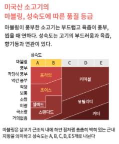 성숙도와 마블링으로 구분되는데 국내마트에서 보이는 대부분은 초이스등급과 프라임등급입니다. 한국에서는 마블링이 좋은 소고기를 선호하니까요.