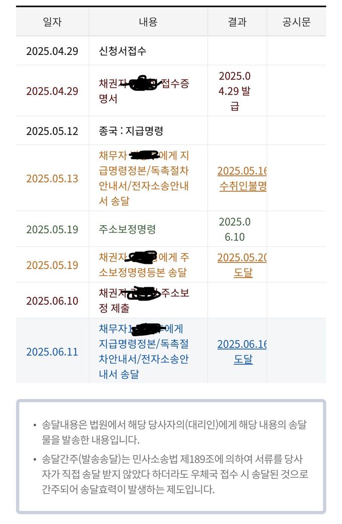 지급명령을 신청하고 주소보정 명령 신청이 떨어져서 해당 부분까지 완료하였습니다.2025년 6월 16일에 지급명령이 전달되었고