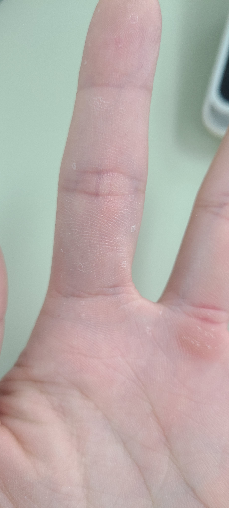 특별한 이상은 아니고 손가락의 각질이 벗겨진겁니다. 보습제만 충분히 발라 주셔도 됩니다. 최대한 피부에 물이나 세제, 화학약품이 닿는 것은 피하시구요.