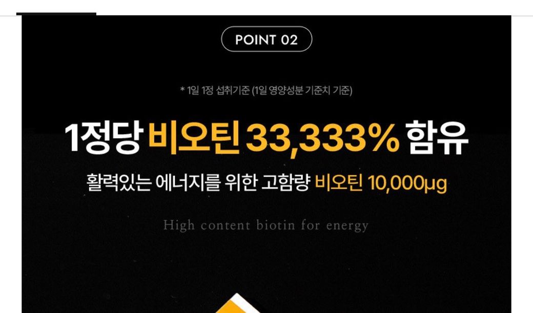 한알(1정)에 비오틴 함량이 10000ug라는 뜻이 맞습니다 이는 엄청 고함량이며 너무 고함량을 복용하는 경우에는 오히려 여드름이 나고 트러블이 유발될 수 있습니다. 따라서 하루에 최대 5000ug정도만을 권장드립니다