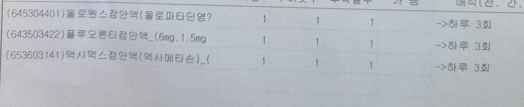 이 약들을 넣어도 차도가 없고 가려움,이물감,충혈만 더 심해져서 오늘 다른 안과를 가서 세가지 약을 처방 받았습니다.