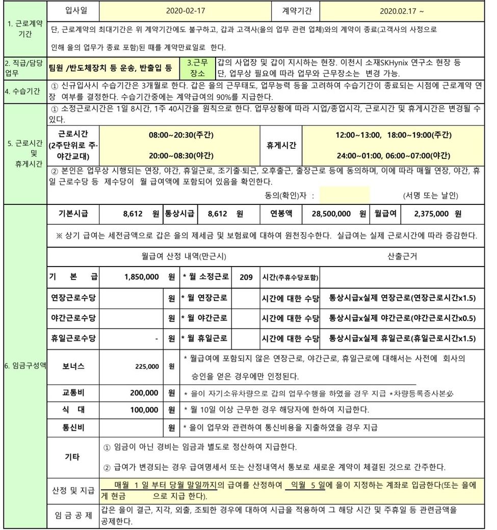 계약서상 근무시간은 주5일 기본에 2주 주야교대이나