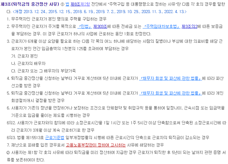 근로자퇴직급여보장법 시행령 제3조(퇴직금의 중간정산 사유) ① 법 제8조제2항 전단에서 “주택구입 등 대통령령으로 정하는 사유”란 다음 각 호의 경우를 말한다. <개정 2013. 12. 24., 2015. 12. 15., 2018. 6. 19., 2019. 7. 2., 2019. 10. 29., 2020. 11. 3., 2022. 4. 13.>