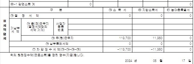 제 2023년 원천징수영수증을 확인해보니 결정세액이 0원으로 적혀있습니다. (맨아래 이미지 첨부)
