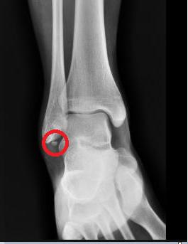 아래 X-ray는 비골 아래에 위치한 뼈조각이며 Os subfibulare라고 부르는데 증상을 유발하지 않는다면 전혀 제거할 필요가 없는 부위입니다. X-ray를 찍다가 우연히 발견되는 경우가 많습니다.