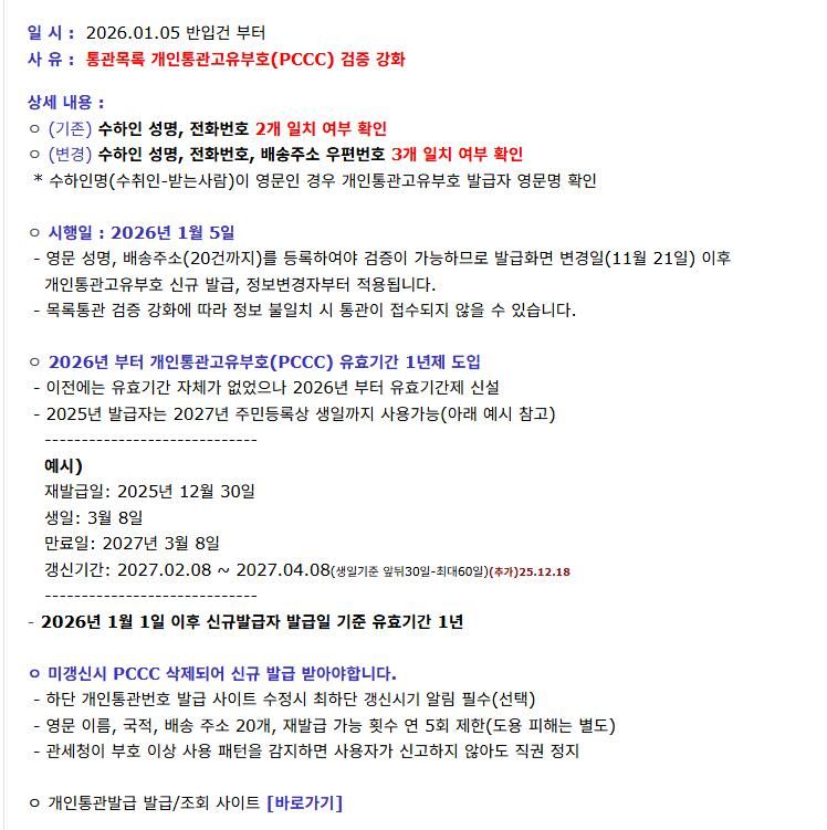 통관목록 개인통관고유부호(PCCC) 검증 강화