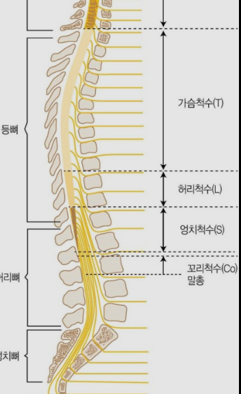 아래 그림에서 보시듯이 척수는 사람마다 다른데 흉추 12-요추 2번 정도 위치까지 뻗어있습니다.