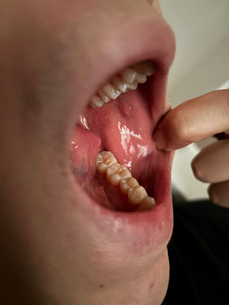 사진에서 보이는 병변은 아래 어금니와 맞닿는 볼 점막 부위에 위치한 작은 돌출 형태로 보이며, 표면은 비교적 매끈하고 주변 점막과 색 차이가 크지 않은 편입니다. 이런 위치에서 가장 흔한 원인은 반복적인 볼 씹힘에 의해 생기는 외상성 섬유성 결절입니다. 치아에 지속적으로 마찰되는 부위에 생기며 작은 혹처럼 보이고 오래 지속되는 경우도 흔합니다. 통증이 거의 없고 크기 변화가 크지 않은 특징을 보입니다.