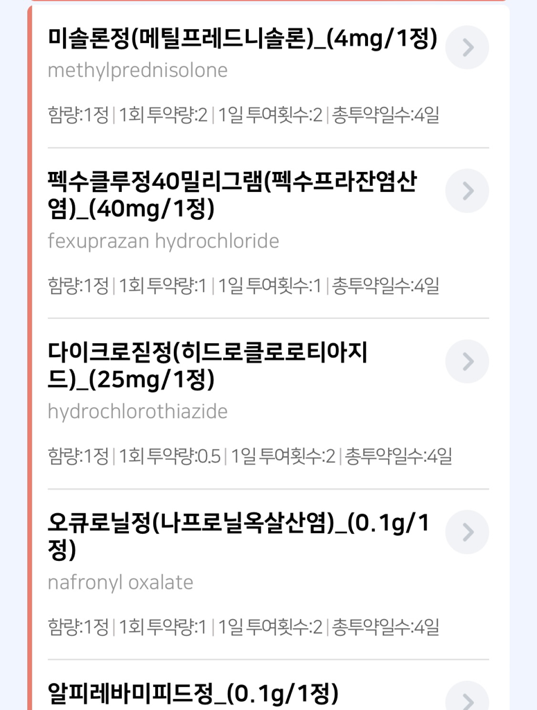 미솔론정 / 펙수클루정40mg / 다이크로짇정 / 오큐로닐정 / 알피레바미피드정에는