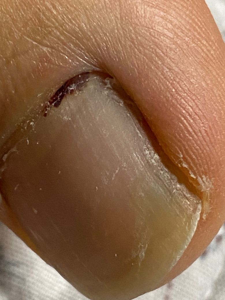 • 발톱 표면 오염이 아니라 발톱 아래 변화로 보이지만 경계가 비교적 일정.