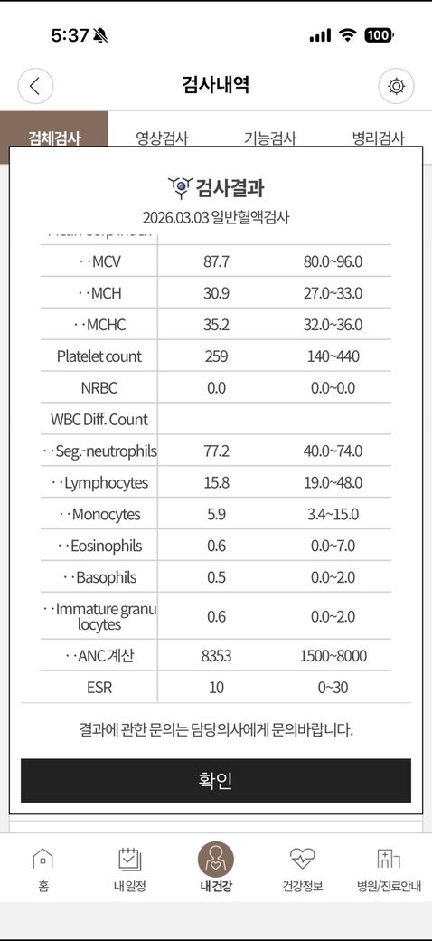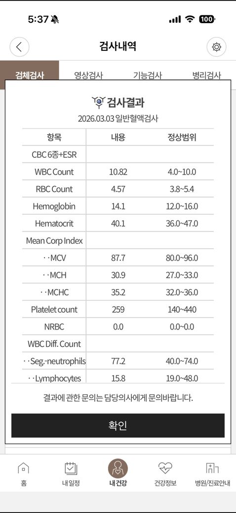 CRP랑 wbc가 염증 수치입니다. Wbc가 정상보다 살짝 높지만 crp는 정상이라서 가벼운 감기일때의 결과라고 보여집니다.