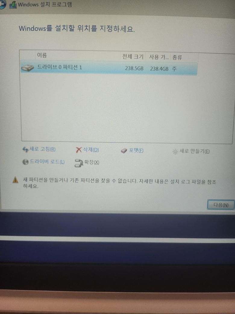 드라이브가 1개 밖에 없으면 저기다가 윈도우를 설치하셔야 하겠네요