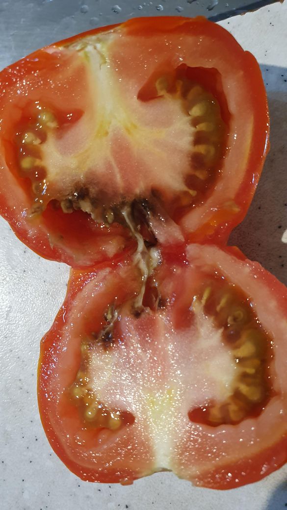 토마토 외부의 모습은 정상인데 반으로 갈라서 안을 보니 갈색 또는 검게 변한 부분이 있는데요.
