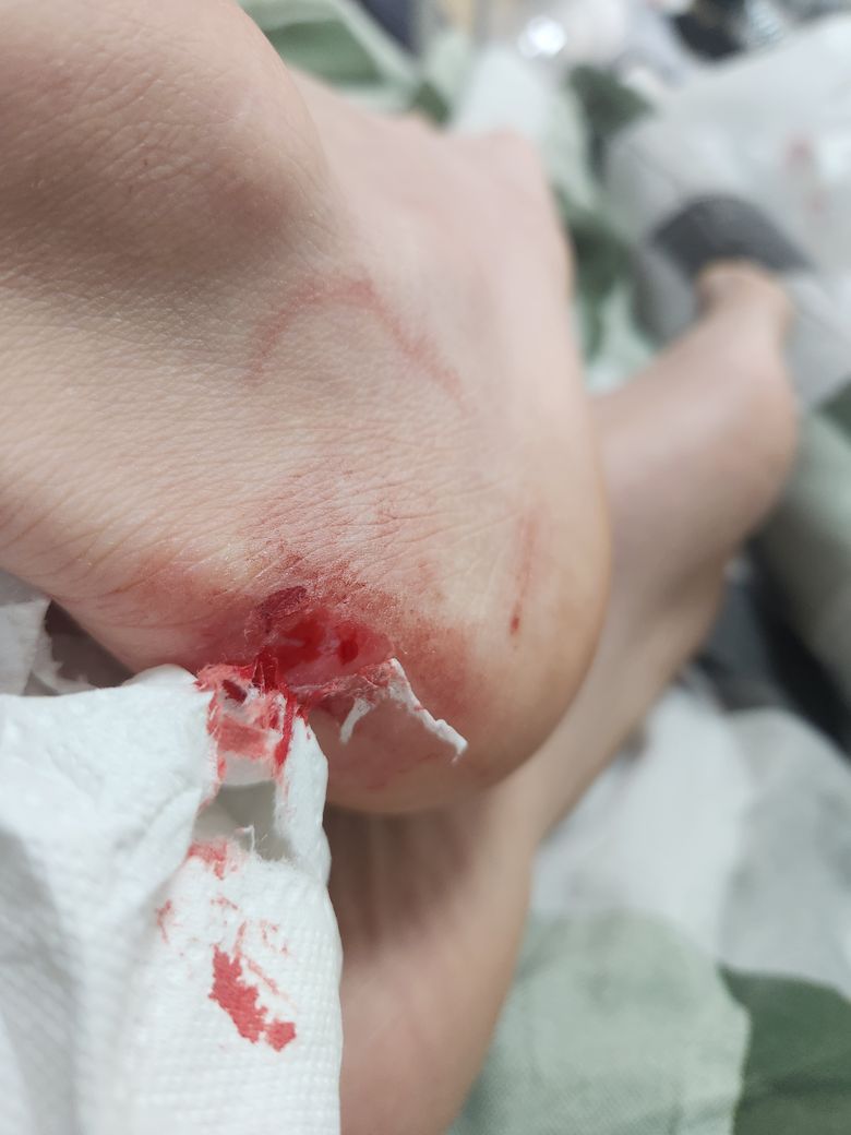 사진과같이 뒷꿈치가 문틈에 파였는데 2시간째 피가 안멈춰요