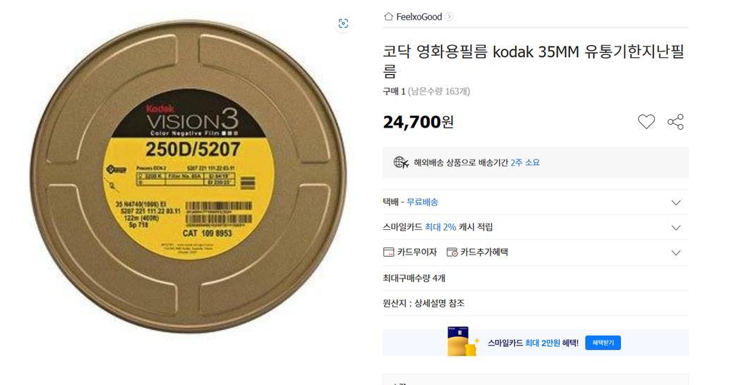 에서 필름을 구매하였습니다. 문의 내용을 보아 확인했을때도 필름 한 롤(약 1.6m)이 아니라 사진에 나온대로 벌크 필름(400ft, 약 120m)을 판매한다고 되어있었는데, 배송이 온 것은 한 롤입니다. 대표 이미지로 나와있는 것은 kodak사의 vision3 250d/5207에 cat109 8953 모델이고, 400ft, 즉 122m필름입니다.