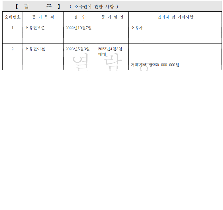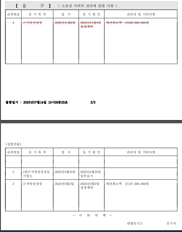 2. 을구에 적힌 1번은 빨간 취소선으로 작성되어있는데 그러면 현재 상황에서는 2, 3번이 1순위에 해당하는 것이며, 근저당 말소 후 전입신고 시 2, 3번도 빨간 취소선으로 변경되며 4번으로 들어가는 제가 순번이 이력상 4번이고 실질적인 1순위가 해당하는 것인지 궁금합니다.