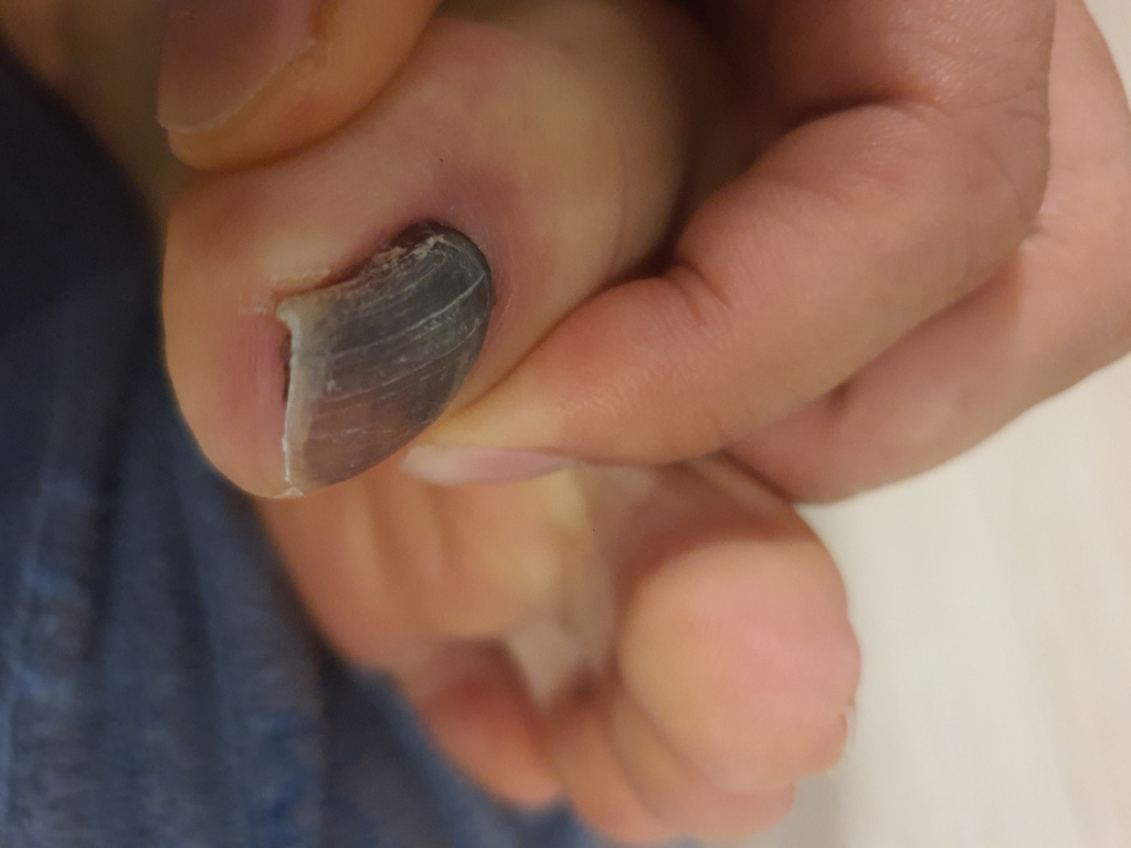 발가락 안쪽으로 출혈이 발생하면서 말 그대로 피멍이 든 상태를 의미합니다.