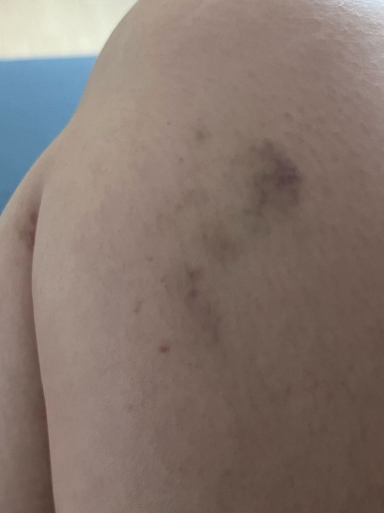 오른쪽 허벅지 안 쪽에 멍이 들었습니다