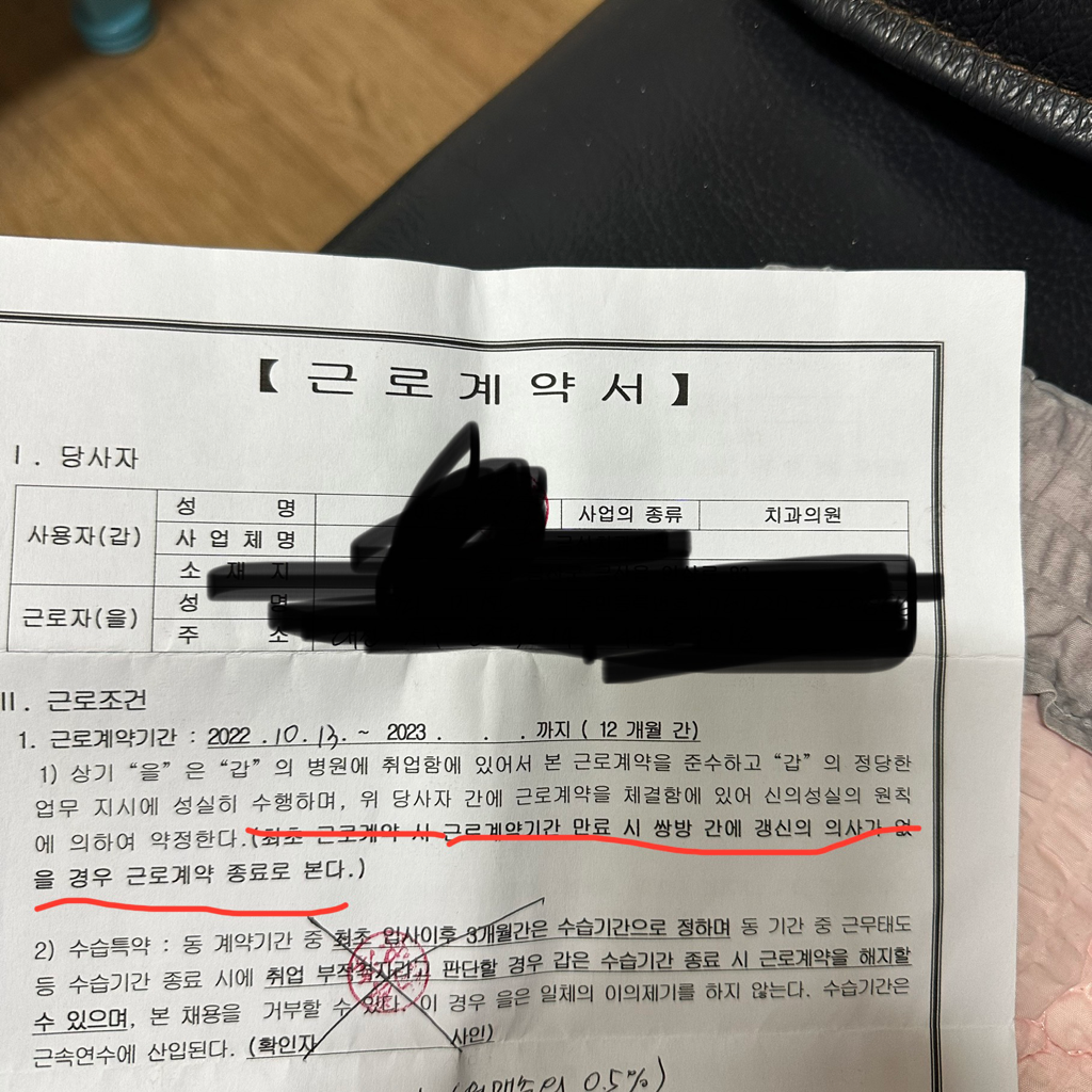 1년 기간을 정한 근로계약을 체결했으므로 1년이 되는 2023.10.12.까지 근무하고 퇴사하면 손해배상 책임을 지는 등 법적 불이익은 발생하지 않습니다.