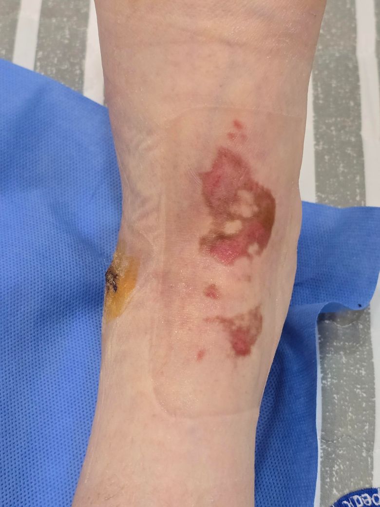 압박붕대가 너무 강하게 감겨 있으면 혈액 순환이 방해되어 피부에 열이 갇히거나 피부가 눌려 손상될 수 있고 혹은 압박붕대를 너무 오랫동안 착용하면 피부가 과도하게 압박을 받아 피가 제대로 순환하지 않게 되어, 피부가 건조해지거나 부풀어 오르고, 심한 경우 화상처럼 보일 수 있습니다.