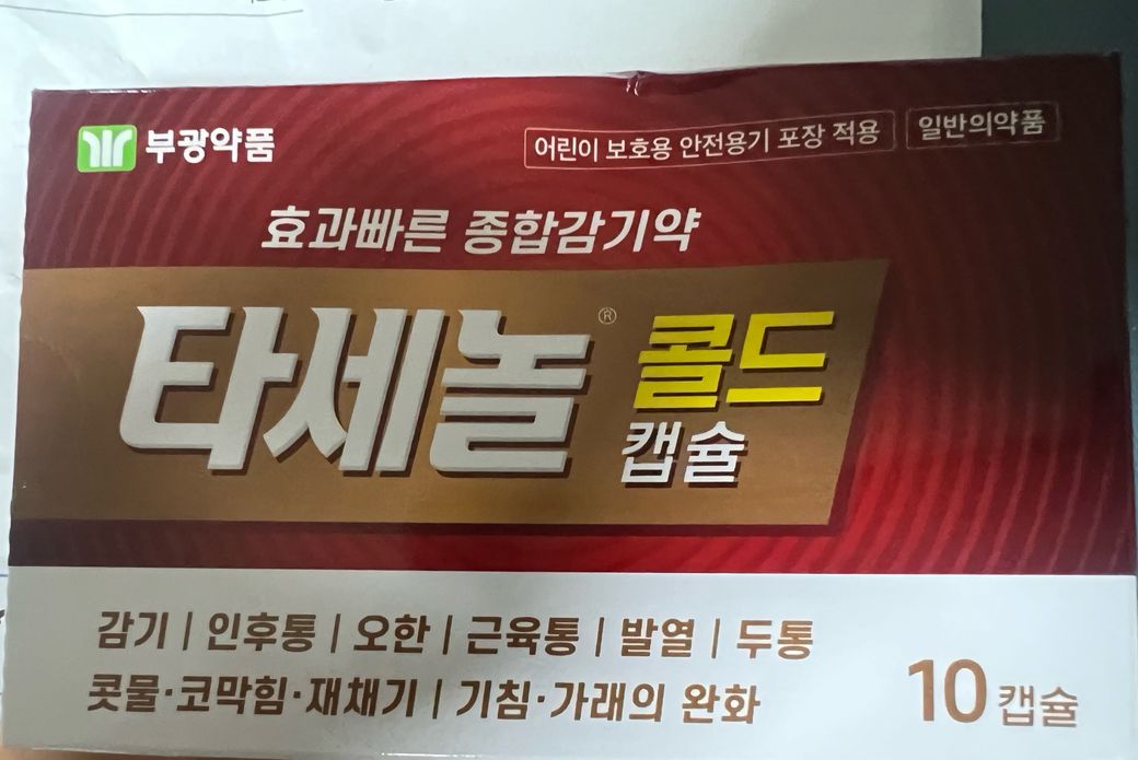약국 종합감기약 타세놀콜드캡슐은 아세트아미노펜, 카페인무수물, 클로르페니라민말레산염, 덱스트로메토르판브롬화수소산염수화물, DL-메틸에페드린염산염, 구아이페네신 성분입니다.
