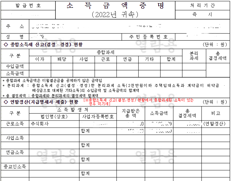 종합소득세 신고자용으로 다시 조회해보시면 근로와 사업소득 모두 기재된 소득금액증명이 나옵니다.