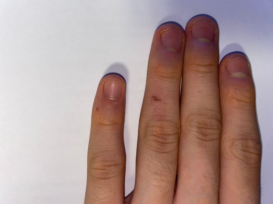 약지와 소지 왼쪽에 갈색 점들이 생겼는데 무슨 병인지 궁금합니다. 비누로 지워보려 해도 지워지지 않습니다.