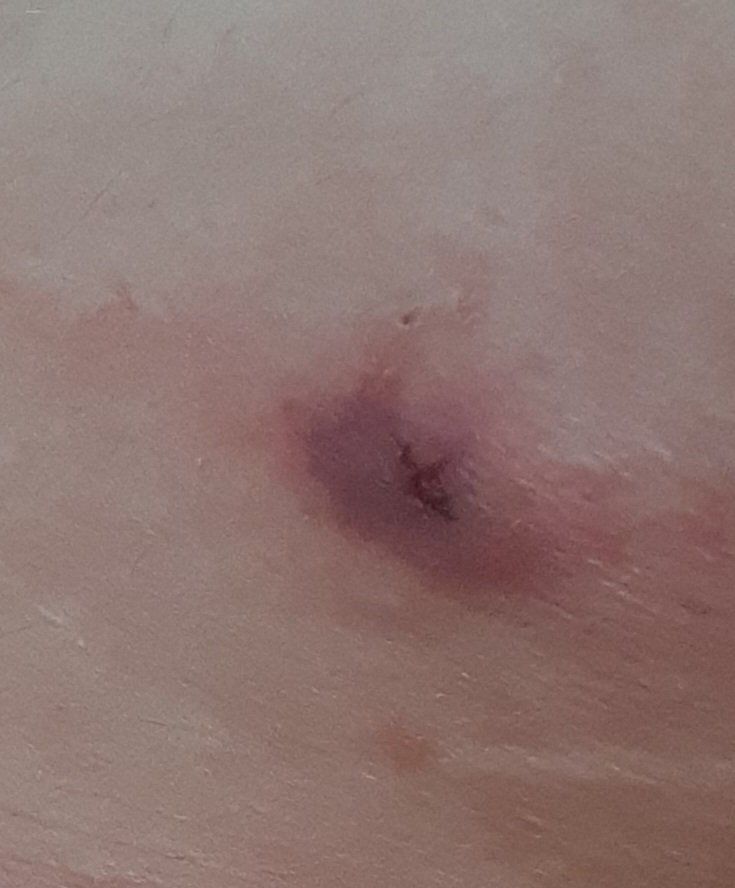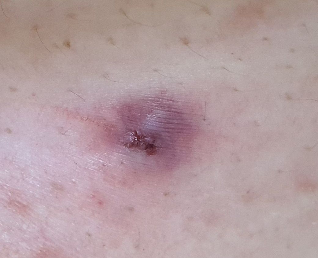 피부에 발생한 일반적인 모낭염으로 보이며 억지로 고름을 제거하려고 하면서 피하 출혈이