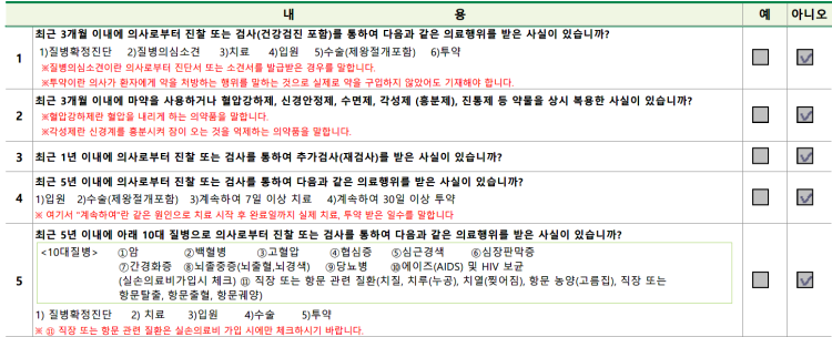 1. 3개월이내 의사로 부터 진찰 또는 검사틀 통하여 질병진단, 소견이나 치료 입원, 수술, 투약여부