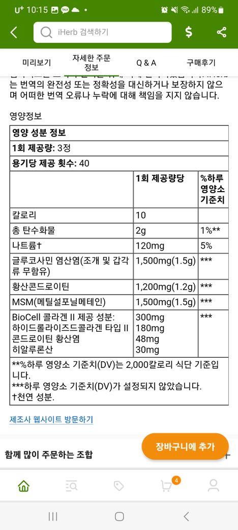 MSM 글루코사민 콘드로이친 성분의 영양제를 복용 중